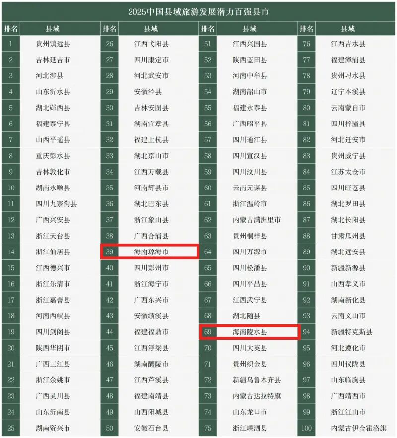 近日,竞争力智库、北京中新城市规划设计研究院等机构联合发布了《中国县域旅游竞争力报告2025》(以下简称《报告》),揭晓了2025中国县域旅游发展潜力百强县市(简称2025中国旅游潜力百强县)、2025中国市辖区旅游综合竞争力百强区(简称2025中国旅游百强区)等名单,为各县域旅游产业发展提供参考。其中,海南省琼海市、陵水黎族自治县上榜2025中国旅游潜力百强县,海南省三亚市天涯区、海棠区、吉阳区上榜2025中国旅游百强区。