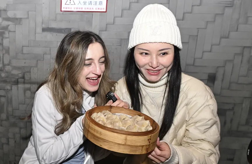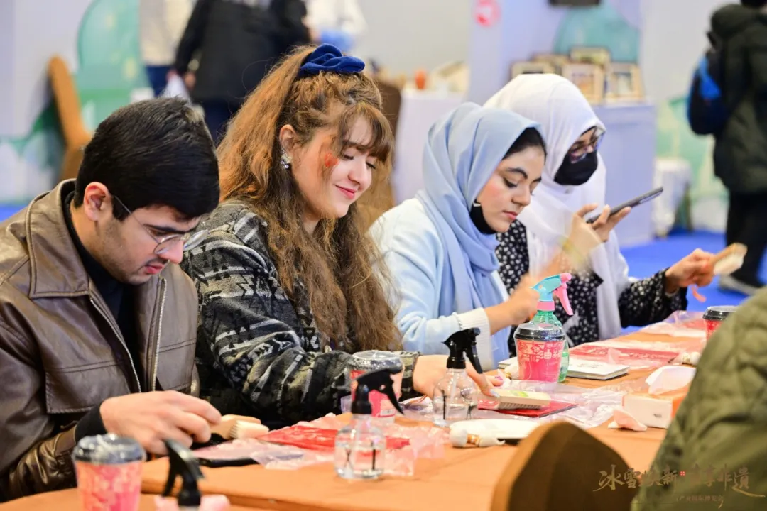 但这里不止喂饱你的胃,还能满足你的手!鱼皮画、人参香珠、满族刺绣……十几种非遗研学课开课,连外国友人都埋头搓珠子、刻皮雕,做完后举着自己的“福”字小鱼作品,开心得像中了奖。这种 “可尝可玩” 的深度体验,让传统文化变得亲切又好玩。