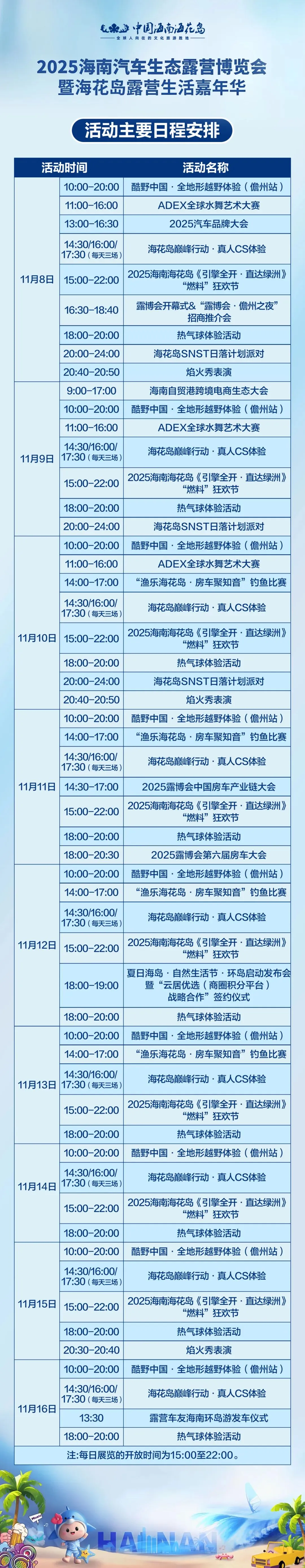 11月8日-16日,儋州海花岛1号岛观海公园,2025海南汽车生态露营博览会暨海花岛露营生活嘉年华,带上家人朋友,赴一场海陆空联动的狂欢之约,我们不见不散!
