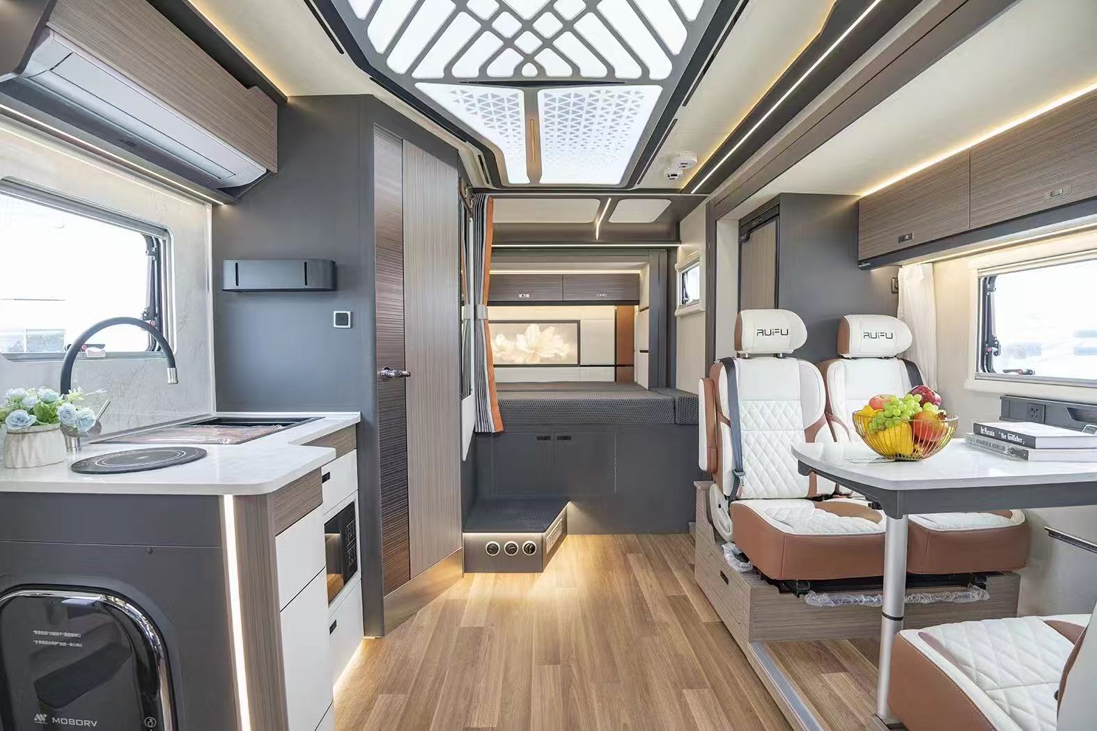 经典的依维柯欧胜底盘+3.0T柴油发动机+8At采埃孚变速箱,驾驶室标配气悬座椅,开车时非常舒服。技术设计方面:整车平衡设计(前后重量的误差不超过4%),电器保护系统(保护电器方面的安全)屋脊式设计(永远不存水,也不漏水) 配置方面:进口德国朗仕玻璃钢+高强度铝合金骨架车身,独有电泳高强度钢副车架,冬季有采暖:伟巴斯特燃油暖风热水一体机,夏季有空调:1.5P格力家用空调,厨房有:柴油灶,微波炉、电磁炉、洗菜池还有148L房车专用冰箱,电器方面:整车标配920Ah锂电、200W太阳能、水路方面:210L清水箱、100L副水箱、40L灰水箱,后横床降低了高度,方便老人孩子上下床。乘用车座椅,提供乘用车的安全保障。还带有一个独立四向滑移座椅,侧滑出来可以大角度放倒休息,后拓壁画灯创新设计,圆弧穹顶造型,扩展视野,营造出更大的空间感。73cm侧拓展与60cm后拓展,极致的尺寸带来极致的体验,车内面积达到了13㎡,让您在车内活动自如,后部贯通储物仓,总容量达到了1000L。