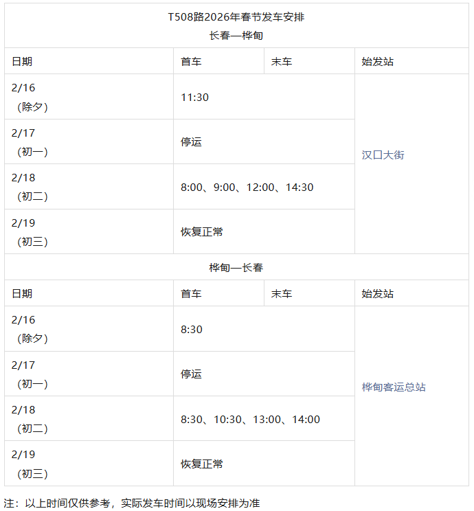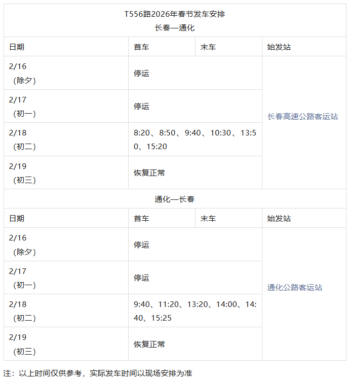 长春城际公交春节发车时刻表来了